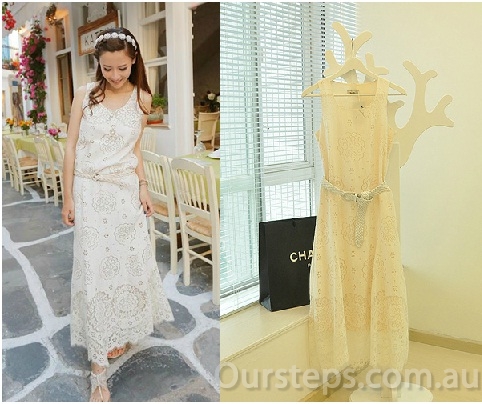 2. 辣椒款希腊行超美~超美仙女范的长裙~定位华丽的蕾丝花纹,今年的最新款哦~搭配一条编织腰带,显得身材比例超级棒的!$40