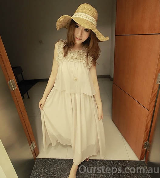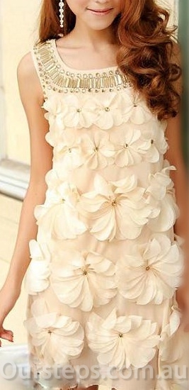 3, 欧美大牌的设计哦~用了飘逸又带垂感的复合丝,实物超美的~胸前的是立体花朵,上面还有A钻和珍珠点缀呢~~仙死了~上面一层刚刚好盖在小腹上,也不显肚腩呢~ $55尺寸:{平铺测量} 132cm 胸 86cm 腰 52-90