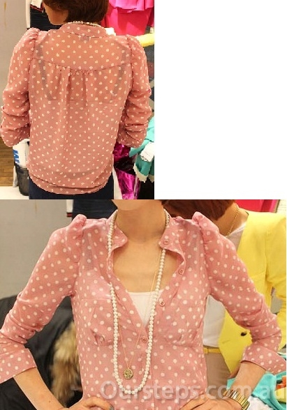4. 韩版嫩粉色水玉波点口袋立领垫肩耸肩修身女人味雪纺衬衫, 超级好看哦. 65cm 胸 84cm 肩 32cm 袖 61cm $26
