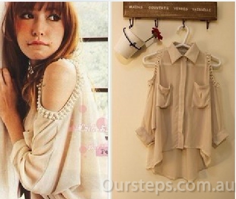 15。小复古甜美全手工镶珍珠 露肩雪纺性感宽松蝙蝠袖衬衫,肩部是特色哦,超级好搭的一款雪纺衫,均码~ $30